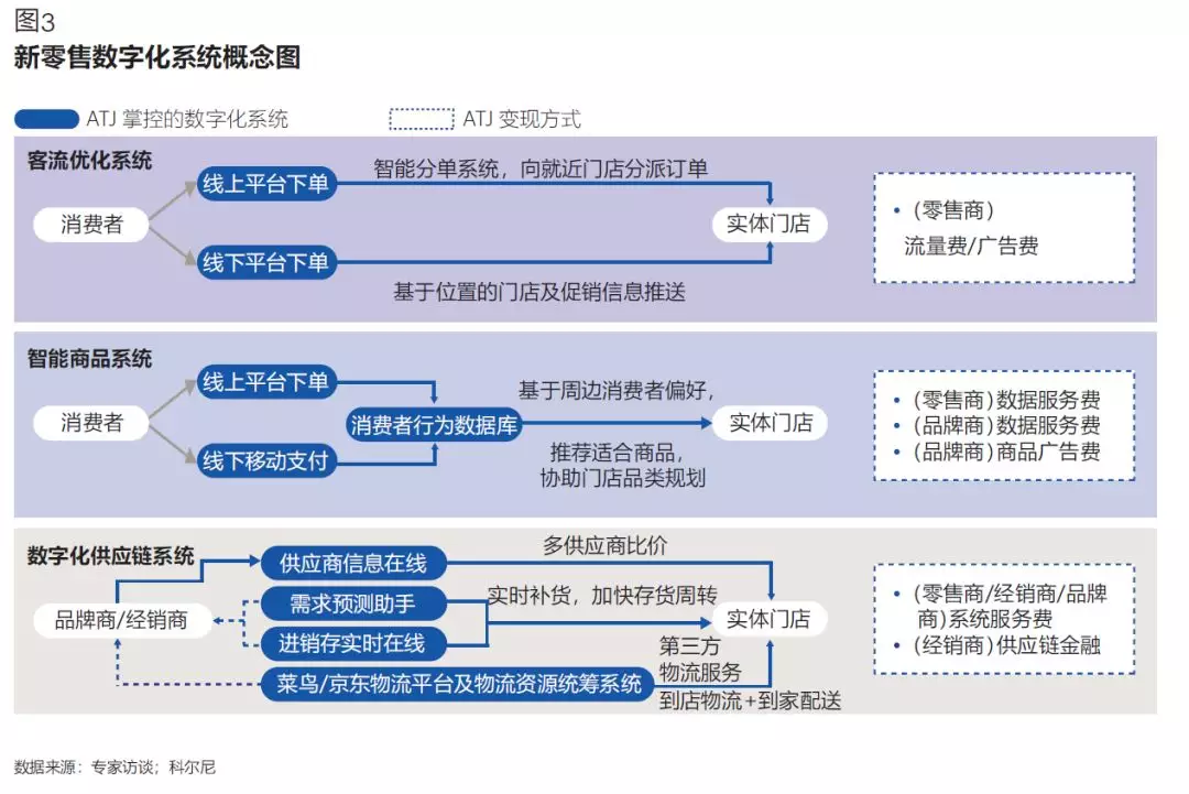 而互聯網巨頭們屆時可以通過各類輕資產的衍生服務變現,無需直接參與零售運營。以下詳述科爾尼對三大數字化零售系統的設想: