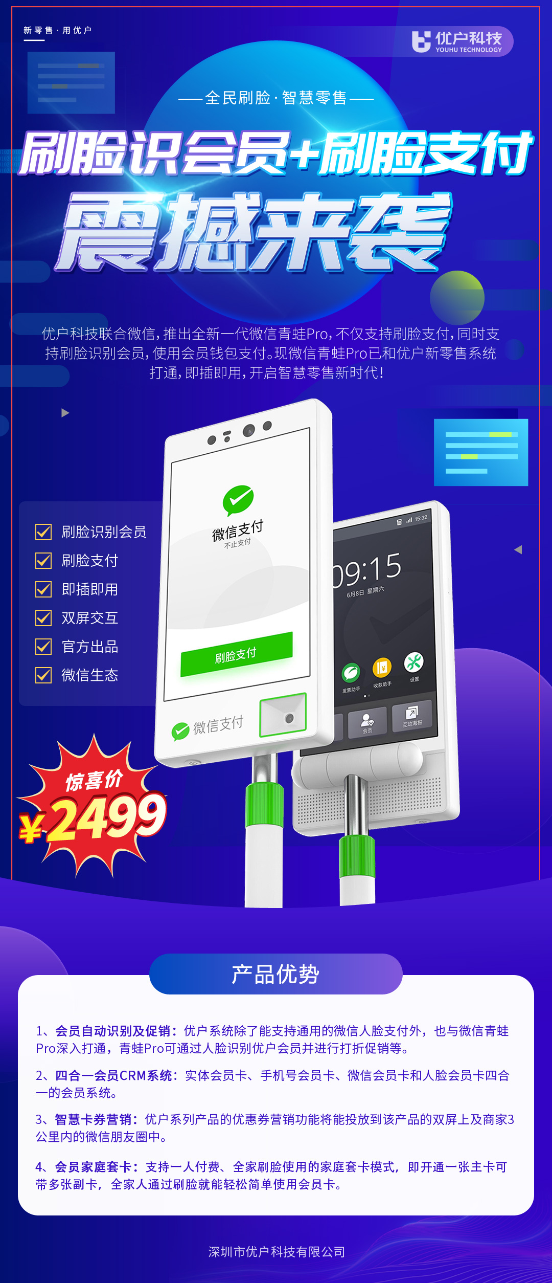 優(yōu)戶科技聯(lián)合微信,推出全新一代青蛙pro,不僅支持刷臉支付,同時(shí)支持刷臉識(shí)別會(huì)員,使用會(huì)員錢(qián)包支付。