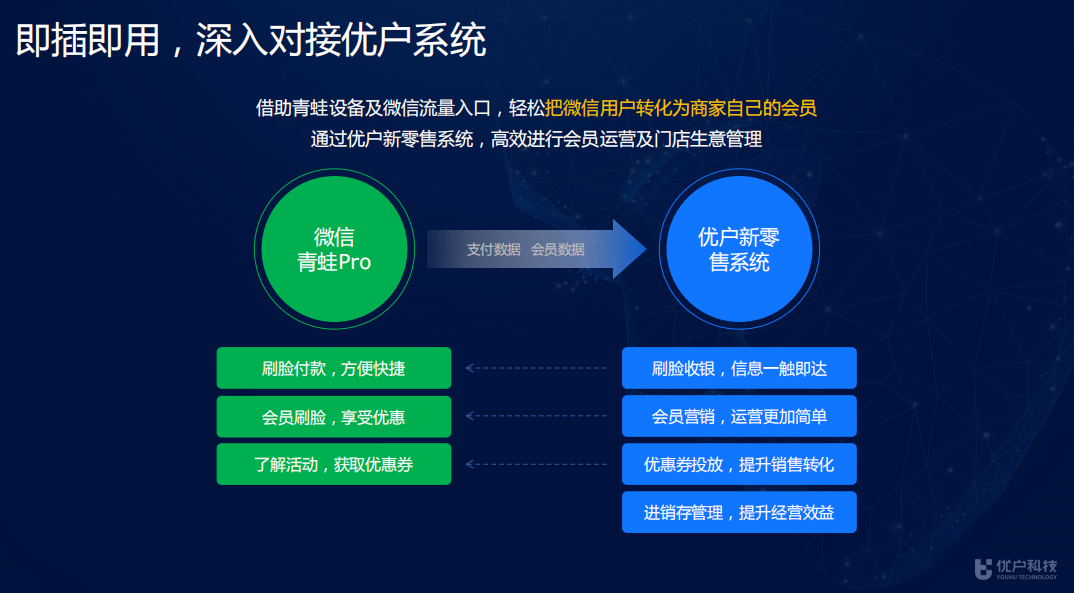 1.會員自動識別及促銷:優戶系統出了能支持同意的微信人臉支付外,也與微信青蛙pro深入打通,青蛙pro可通過人臉識別優戶會員并進行打折促銷等。