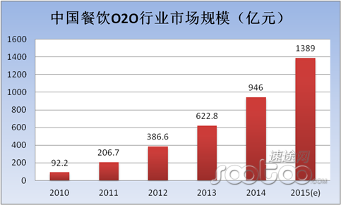 2015年,互聯(lián)網(wǎng)O2O模式在中國(guó)進(jìn)入高速發(fā)展階段,成為互聯(lián)網(wǎng)巨頭們的必爭(zhēng)潛力市場(chǎng)。在2010年只有92.2億元的市場(chǎng)規(guī)模,而在2015年這個(gè)數(shù)字預(yù)計(jì)將達(dá)到1389億元,預(yù)計(jì)相比2014年將增長(zhǎng)46.8%,五年時(shí)間市場(chǎng)擴(kuò)大超過(guò)十倍。日益普及的移動(dòng)支付習(xí)慣、餐飲O2O的巨大市場(chǎng),以及商家越來(lái)越完善的服務(wù)、價(jià)格補(bǔ)貼等,促進(jìn)了餐飲O2O這一行業(yè)的發(fā)展繁榮。