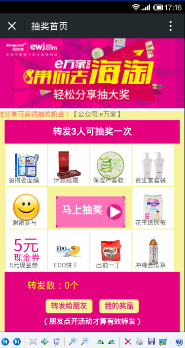 本次案例,e萬家使用的是優戶的“分享抽大獎”,它是一款互動效果非常好的營銷利器,一來提升用戶參與感,二來通過現金券能給網上超市引流,帶來直接消費。