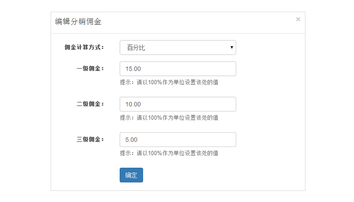 可不限制分銷員得到傭金的條件,也可設(shè)置分銷員達(dá)到”購(gòu)買一單“、”達(dá)到單數(shù)“、”購(gòu)買金額“后方可得到傭金;傭金計(jì)算方式可按百分比或固定金額計(jì)算,可靈活調(diào)整。
