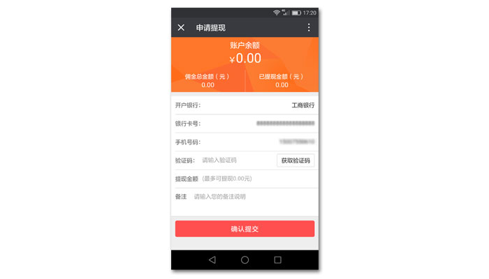 所有分銷員的傭金達(dá)到提現(xiàn)條件后即可申請(qǐng)傭金提現(xiàn),提現(xiàn)金額在審核后直接到達(dá)分銷員的賬戶。