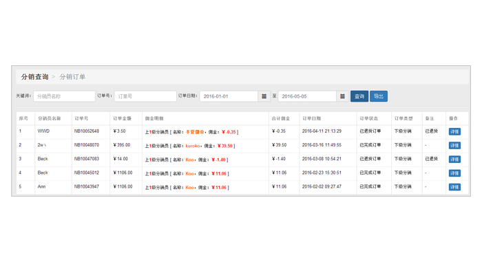 商家后臺(tái)可以查詢所有分銷員信息、分銷訂單和分銷傭金明細(xì)。